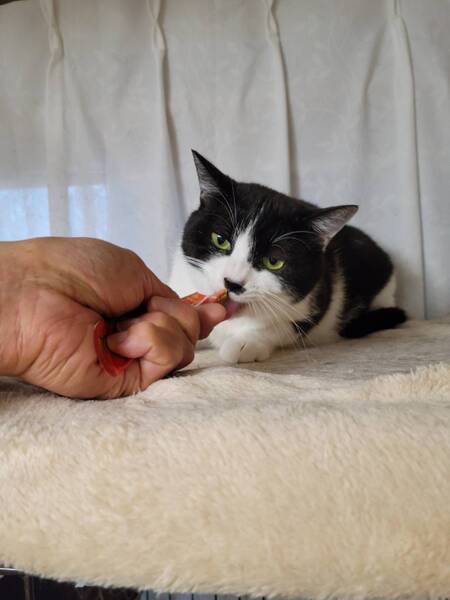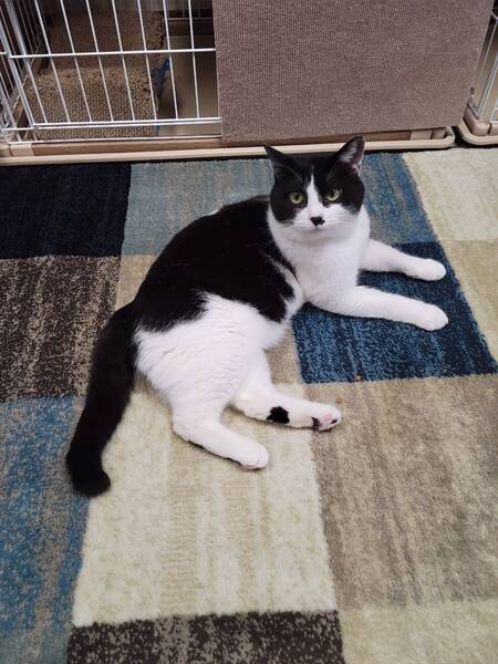 | 特徴(性格など) | 白黒 オス 検便、ワクチン接種済 体内外寄生虫駆虫済 エイズ・白血病検査済、陰性です 去勢手術済 他の猫たちと室内飼養中 ごはん大好き、おとなしくて甘えてくる可愛い子です 抱っこも好きです |