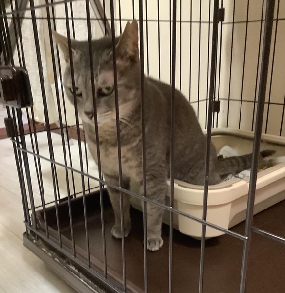 | 特徴(性格など) | 珍しいグレーの毛並みが美しい美波ちゃんは、猫らしいツンデレな性格です。最初はちょっと怖がりさんでしたが、食べるのが大好きなので、人の顔を見るとニャーニャー鳴いてご飯をおねだりしていますし、ご飯を食べている間に体を撫でられるようになってきました。ケージにスリスリ身体を擦り付けて甘える仕草も見せてくれるので、馴れるのも時間の問題だと思います。妖艶なこの眼差しで見つめられたら、ご飯でもちゅーるでもついあげたくなってしまいますね(笑)。 | ||
