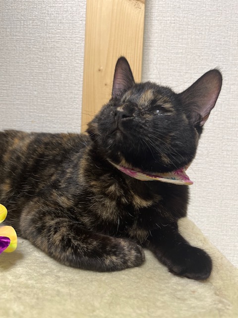 | 特徴(性格など) | ☆☆☆ご希望の方は、以下のアンケートフォームにご記入の上、送信してください☆☆☆ ねこ親希望アンケート→ http://chibawan.net/contactform_cat 【猫No】3470 【愛称】キャサリン 【性別】メス 【年齢】推定7ヶ月(21/09頃生) 【毛色】サビ 【体重】3.0㎏ 【状態】ワクチン接種済(22/01/27)、血液検査済(エイズ-・白血病-)、不妊手術済、マイクロチップ装着済 【預かり場所】浦安市 【日記】インスタグラム https://www.instagram.com/pupu_pipi_edamame/?hl=ja 【経緯】横浜市動物愛護センターより引き出し 【性格】はじめは緊張して固まっていましたが撫でられる事は好きです。猫じゃらしも好きなので慣れたらたくさん遊びます!抱っこは苦手ですが甘えたい時はぴったり寄り添ってきます。 【補足事項】保護された時に酷い猫風邪を患っていて両目が塞がっていました。その後センターで治療を受けて目を開く事ができるようになりましたが引き出し後右目の角膜に穴が開いてしまい眼球摘出手術をおこないました。 片目になってしまいましたが両目があった頃よりも快適に生活が送れていて何も支障はなく過ごせています。 左目も酷い瞬膜癒着がありましたがこちらも瞬膜切開手術を受けました。 今のところは目のケア及び通院の必要はありませんと獣医師からは言われています。 【その他】以下の条件をご快諾頂き、預かり宅から1時間半以内のご家庭からのアンケートをお待ちしております。 ・愛情いっぱいの終生飼養 ・ネコにあった生活スタイル ・完全室内飼育および脱走防止対策 ・定期的なワクチン接種などの健康管理 ・譲渡後も猫の様子をご連絡頂ける方 なお、お世話をする方がご高齢の方、単身者のお申し込みにつきましては、お断りする場合がございますので予めご了承ください。 |