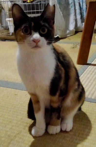 | 特徴(性格など) | 三毛 抱っこも出来る、人なつこいビギナー向き レボ、検便、シャンプー(!)等済 他の子達もよろしく! このページの8匹以外にも保護猫居ます |