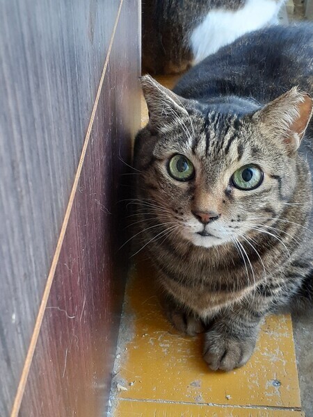 | 特徴(性格など) | 大きな体のがっしりしたキジトラ君。生命力を感じる力のある瞳、艶々と綺麗な毛並みをしています。飼い主は多頭飼育で愛情を注ぐ余裕がなかったようで、元気君は、怖がりですが、毎日お世話に通うボランティアさんのすることを、すぐ近くでじっと見つめるようになりました。ゆっくりした変化ですが、月日と共に少しずつ心を開き、可愛くなっていく元気君の様子を楽しんでくださるご家族を求めています。 健康状態は良好です。 ウイルス血液検査(エイズ陰性 白血病陰性) ノミダニ、回虫駆虫済 |