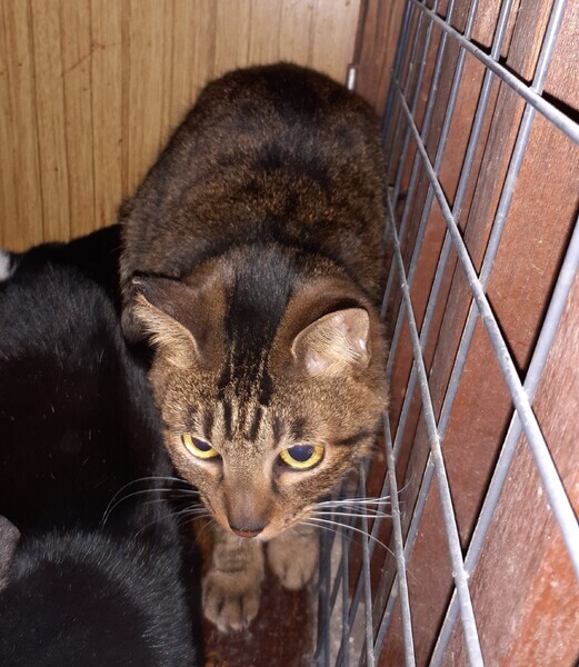 | 特徴(性格など) | パッチリした瞳が可愛いキジトラさん。おやつが大好きで、怖くてもおやつをもらいにきます。触れると緊張しますが、背中を撫でても大丈夫になりました。心を開くのを待ってくださる里親さんをお待ちしています。 FIVは、血のでるような喧嘩をした場合以外にうつることは珍しく、発症しないまま生涯を終えることも普通にあります。 去勢手術済 ウイルス血液検査 (FIV陽性 FeLV陰性 ) ノミダニ回虫駆虫済 |