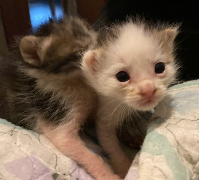 | 特徴(性格など) | 白ベースに片耳黒ブチの女の子。一番小柄だけど、ミルクを飲むのが上手です。 白ベースに黒茶シマの男の子。一番大きく生まれて今も一番大きい体のしっかりした子。 全体に黒っぽいシマ交じりの男の子。今のところ小柄。 三匹ともしっぽは真っ直ぐで長いです。 |