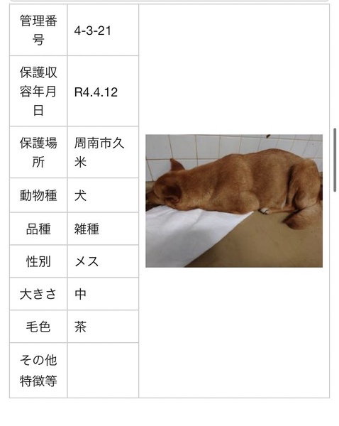 | 特徴(性格など) | 毛色…茶色 唸りも威嚇もありません ただただ怯えています 18キロくらいの女の子 |