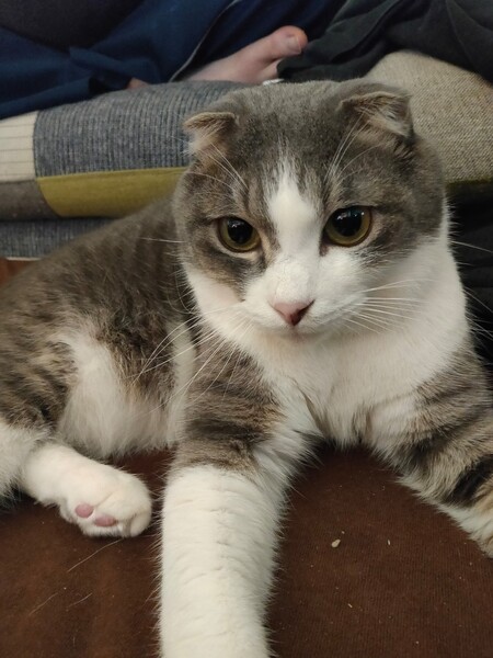 | 特徴(性格など) | グレー系スコティッシュフォールドです。 撫でられるのは好きですが、頭以外を触ると怒ります。 |