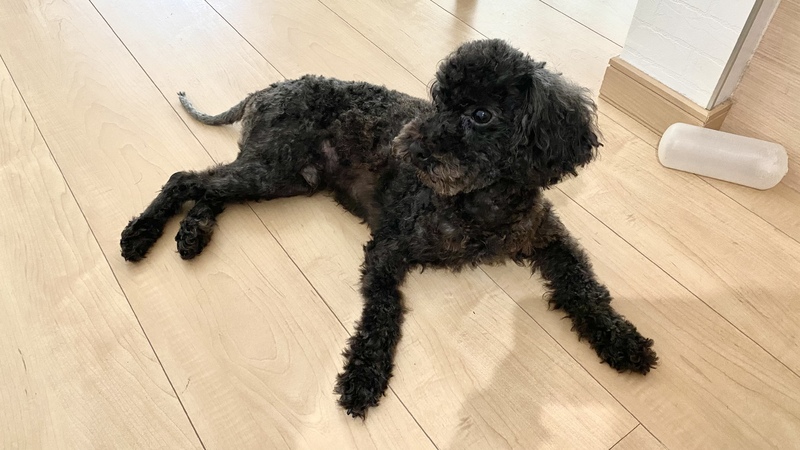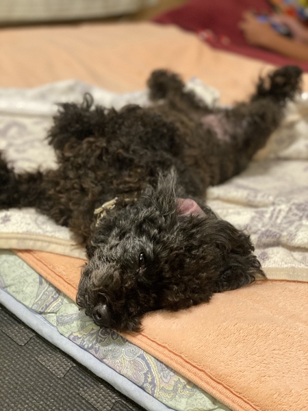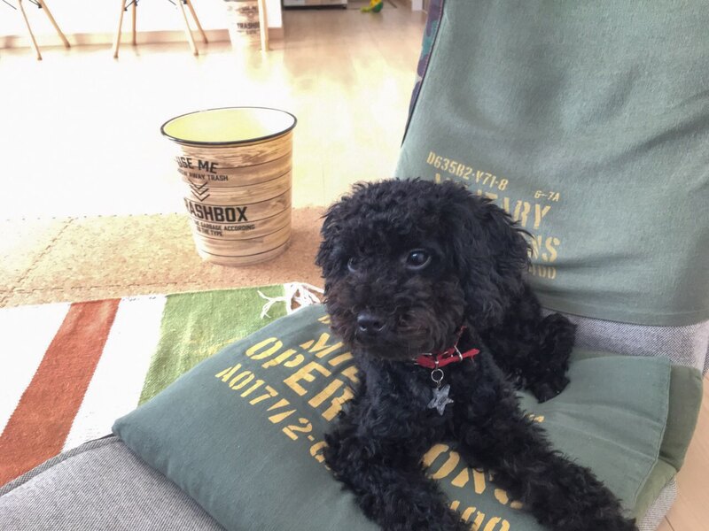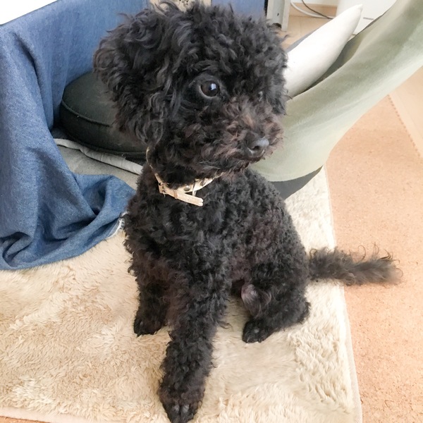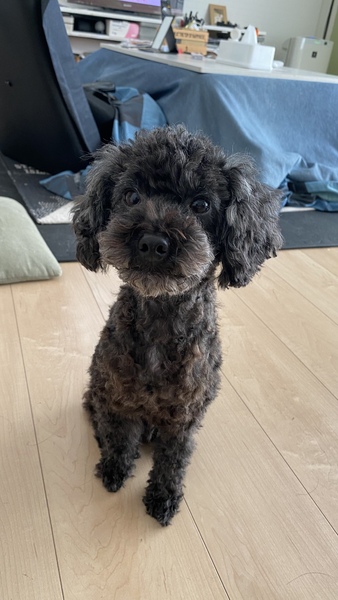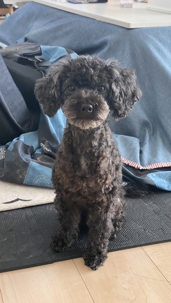 | 特徴(性格など) | 黒毛で、自然交配なのでペットショップのワンちゃんでは無い為、尻尾が長い珍しいトイプードルです。(知人の買っているトイプードル両親から生まれ育ち譲って貰いました) 人から怖い目に遭ってないので、とても人懐こく、順従で忠誠心も強く賢いワンちゃんです。ただ、その分寂しがりで甘えん坊です。懐くと、ついて回る程です。 |