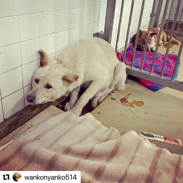 | 特徴(性格など) | 毛色…白ですが毛並みも悪くダニも顔にたくさんついています 外での過酷な生活が伺えます 唸りも威嚇もありません ただただ怯えています |