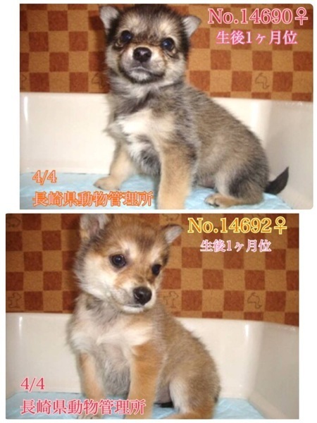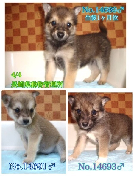 | 里親募集する理由 | まだよちよち歩きの生後1か月位、とっても可愛い雑種の子犬(男の子3匹と女の子2匹)兄妹ですฅ•ﻌ•ฅ 〜4/25追記〜 女の子2匹は里親様が決まりました! 野良ちゃんが6匹生んだようです、長崎県壱岐市郷ノ浦町内にて4/4保護され保健所収容、4/20に長崎県動物管理所へ移送されてきました。(うち1匹は譲渡になりました) 突然親犬と離れ離れになり連れて来られてどんなに寂しく心細いか。 残るこの子達5匹も、一日も早く温かい家庭の中で過ごさせてあげたいです。 ⭐️県外、遠方の方でも譲渡の条件が合い、良縁に恵まれましたら里親になっていただけますのでどうぞ宜しくお願い致します! ※ ※ ※ 長くなりますが犬猫と里親様の幸せの為にも、募集内容を熟読し、必ずご家族とよく相談をされた上、ご家族全員の賛同を得られてからのお問い合わせ をお願い申し上げます。 ⭐️ 外飼いでは無く、室内飼育で家族の一員として迎えて下さる方、どちらの子をご希望か「引き渡し方法」のところにあります【アンケート】にご回答と、どの子をご希望かと共に、お問い合わせを頂けますよう、お願い申し上げますm(_ _)m 優しい職員さん方が大丈夫だよ、幸せになれます様にと毎日触れ合い、声掛けしながら一生懸命にお世話してくださっています。 最初は怯えている子もいましたがだいぶ人馴れしてきて撫で撫でも抱っこも大丈夫、今は尻尾フリフリ寄ってきてくれるようになってきました(^^) 子犬らしい愛嬌たっぷりです♪ 栄養状態や健康状態がいいとは言い切れません。体調も急変しやすいかと思われます(>_<) 何か病気や障害が有るのか無いのかも分かりません。 皮膚炎や脱毛などは見受けられませんが、今後体調の急変もあり得ることを念頭に置き、譲渡後は早急な病院受診が可能なご家庭を希望しておりますm(_ _)m 現在は1日に2回、ご寄付で送って頂いた栄養価の高い良質な仔犬用のドライフード(ネイティブドッグフードパピー)をふやかしたものを食べています。 まだまだ幼い為、長時間のお留守番は出来ません。寂しくて夜鳴きする子もいます。 今後の健康な成長の為に良質なフードを与える事が可能な方、育てる自信と覚悟のある方、飼育経験のある方が望ましいです♡ ※子犬は思っていた以上にお世話が大変だと言われる方が多く、排泄も頻回でこれから甘噛み期もありますฅ•ﻌ•ฅ まだお散歩デビューは出来ませんが今後成長していく中で、急な物音や知らない場所にビックリして怖がって、咄嗟に逃げよう、逃げようとする可能性も大いにあり得る事だと思いますし、その時の力、引きの強さも想定し、急な走り出しや高い塀や壁・柵の飛び越え・急な方向転換や首を振って後退りからの首輪抜け、胴輪抜けにはご用心です! 呼び戻しを教えなければもし逃がしてしまったらピューっと走って行ってしまうタイプかもしれません!(>_<)もし逃がしたらもう捕まえられない!とお考えくださいm(_ _)m ※繰り返しになりますがどんな子であっても、慣れてきても常に、脱走・逃走には充分な注意と最大限の配慮をお願いしております m(_ _)m 適切に制御し、躾や朝晩のお散歩、運動の時間をしっかり取ることの出来る、沢山優しく触れ合って頂ける方、先ずはじっくりと時間を費やし触れ合い、信頼関係を作っていく事の出来るご家庭を希望しております。 ♡人間が焦らずにゆっくり見守りながら、愛情を持って接ししっかりとお散歩にも連れ出して行けば、この子達ならじきに新しい家庭に馴染んでいける、優しい家族に囲まれて思い切り甘えて遊んでほしいのだと思います。 当分の間はかなり手がかかり大変かと思いますがまだ子犬ですし、広い心で、長期戦でもドンとこい^_^と仰って頂ける方、愛くるしいこの子達を尻尾フリフリ♫ニコニコの笑顔にしてくださる方、いらっしゃいませんか? どうぞ宜しくお願い申し上げますm(_ _)m ⭐️必ず室内飼育で、譲渡後速やかに病院受診、健康診断、2回目混合ワクチン、生後4〜6ヶ月頃を目処に不妊手術をする事が可能なご家庭。 ⭐️まだまだ幼い為長時間のお留守番は出来ません。なるべくお留守番の少ない、(4時間以内)沢山優しくスキンシップやコミュニケーションで触れ合っていただけるご家庭。 ストレスが溜まらぬよう成長後の運動量もしっかり確保出来るご家庭m(_ _)m ⭐️トイレの躾は1からとなります。まだ子犬なので躾は入りやすいと思われます。現在ペットシートでトイレの練習中(^^) 最初は何かと手がかかり大変ですが(広めのトイレスペースや、ペットシート、新聞紙を用意など)覚悟と根気・理解で受け入れて下さる方m(_ _)m ⭐️出来れば中型〜大型犬の飼育経験があり自信のある方、愛情を持って犬をしっかり躾することが出来る方、毎日朝晩のお散歩や運動にも充分時間をあてられる方、もし怖がってなかなかお散歩が出来ない時などにはずっと家の中に引きこもりにならぬよう、場合によりトレーナーさんをお願いしてきちんと向き