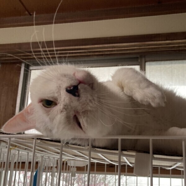 | 特徴(性格など) | ◆イナズマくん イナズマ形の鍵尻尾が自慢の愛されキャラ ○東京都内の多頭飼い崩壊現場から保護されました。 ○保護の様子は「坂上どうぶつ王国」にて取り上げていただきました。 ○推定7〜8歳くらい(2022年4月時点)の男の子です。 ○尻尾はイナズマのような鍵しっぽで、この尻尾からイナズマと名付けられました。 ○身体は真っ白で、顔と頭の一部がグレーです。 ○ご飯が大好き過ぎて、他の猫ちゃんのエサ皿を自分の下に手繰り寄せる器用な癖があります。 ○エサ皿を手繰り寄せられた猫が怒って引っ掻き、顔に傷が絶えませんが、優しい性格ゆえ、やり返すことはありません。 ○撫でられると目を細めて可愛いらしい表情を見せてくれる愛されキャラです。 ○猫じゃらしで遊ぶのも大好きで勢いよく追っかけます。 ○撫でられることが好きですが、慎重な所があるので、時間をかけて仲良くなってくださる里親様をお待ちしています。 ○人が好きな様子なので、1匹に愛情を注いでくださる里親様を希望します。 ★ワクチン済み、不妊手術済み。 ★猫エイズ、猫白血病ともに陰性。 ☆単身のかたはご相談ください。 |
