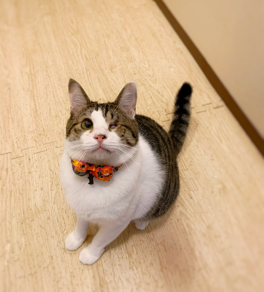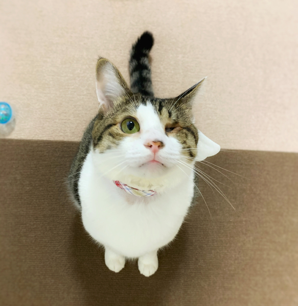 | 特徴(性格など) | 仮名:ルミエル 体重:5.6㎏ 毛色:キジ白(光の角度でサバ白にも見える、芸術的な美しい色合いと模様) 外見も性格も天使のように純真で愛くるしい子。そしてやんちゃ。 人間も猫も大大大好きです。 ☆外見☆ 大きくつぶらなお目目とウインク☆ ピンクのお口はいつでもニッコニコで天使の笑顔 優しいグレー色の縞に、粉雪のような真っ白でふわふわの毛並み。 ハッキリくっきり美しい模様、 色もキジとサバがほんのり交わり、光の当たり方で色が変わる、自然な美しさ 肉球はピンクと黒のアポロチョコ! 見た目や雰囲気もふんわりしていますが、実際触っても モチモチふわふわ、しっとりの触り心地… 癒しと元気をくれる存在です。 ☆性格など☆ とにかく本当に無邪気な子で、今も子猫のように天真爛漫です。 我が家の中で一番元気で、男の子らしくとってもやんちゃな子でもあります。 そして「大の人間好き」! 初対面の人にも、すぐに甘えたりお尻を持ち上げて「なでて~♪」とアピールしたり、 遊んでもらえば永遠に夢中で遊んでいます(笑) 嬉しくなるとあっちにスリスリこっちにスリスリ、止まりません。 病院ですら毎回楽しそうに探検し、先生の胸元にくっついたり看護婦さんにも抱きついてチューまでするほどの懐きっぷりで大変驚かれます^^ すぐにご機嫌に喉を鳴らしながらふわふわベッドにフミフミしたり、しょっちゅう赤ちゃんのように自分のおててをチュッチュ吸っています。 名前を呼ぶとご機嫌で返事してくれますが、その時の声もなんとも言えず可愛らしいです。 先住さんの性格にもよると思いますが、他の猫の事も大好きで、初対面で威嚇する新入り猫相手でも、大喜びで「遊ぼうよ~」と近づき、すぐに仲良くなるのには保護主も大変驚きました。 我が家の猫達とも大変仲が良く、猫嫌いの子ですらいつの間にか打ち解けています。 (現在あまり更新できていませんが、今までの様子は下記からご覧いただけます。) ツイッター http://twitter.com/chatmi9 ブログ http://chachandaisuki.blog.fc2.com/ 【健康状態】 極めて良好です。 食欲旺盛で快便。 (我が家ではトイレの失敗は一度もなく、固まる砂タイプでもシステムトイレでも上手にできます。) ・ノミ取り・駆虫済み ・FIV、FeLVともに陰性 (2022年1月現在) ・3種混合ワクチン3回接種済み(2018年9月、10月、2019年12月) ・去勢手術済み(2018年12月) ・その他、現時点で必要な基本医療ケアは終えています。 (譲渡前にマイクロチップ装着予定) ☆ルミくんの目について☆ 一緒に暮らしてきた保護主にとっては、既にルミくんは片目の猫さんという認識は全くありません。 初めて見た方には、片目を無くした事を、つい可哀想に思ったり、日常生活の大変さを想像してしまう人もいるかも知れません。 しかし実際には、普段の生活としては両目がある子と何も変わりません。 むしろ、ニコニコ笑顔と、いつでも楽しそうな姿に、とにかく元気でかわいい子、という印象しかありません。 ただし、全くなんのケアもしなくといいかと言われるとそうではなく、 瞼がどうしても内部に入って粘膜を刺激してしまうため、涙や目ヤニのケアは毎日しています。 その影響からくるくしゃみや咳もたまにあります。 といっても、目薬をさしたり、涙でかぶれないよう、優しく拭いてあげる事くらいです。 また、獣医からも今のところその必要はないと言われているのでしていませんが、今後もし炎症が進んでしまうようなら、眼球を完全に摘出する手術が必要になる場合があります。 以上をご理解いただき、必要になった場合には処置いただける方、毎日の目のケアを厭わずやっていただける方にお託ししたいと思っています。 |