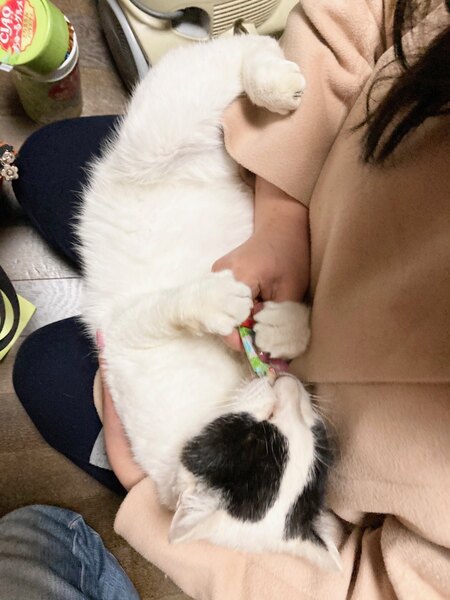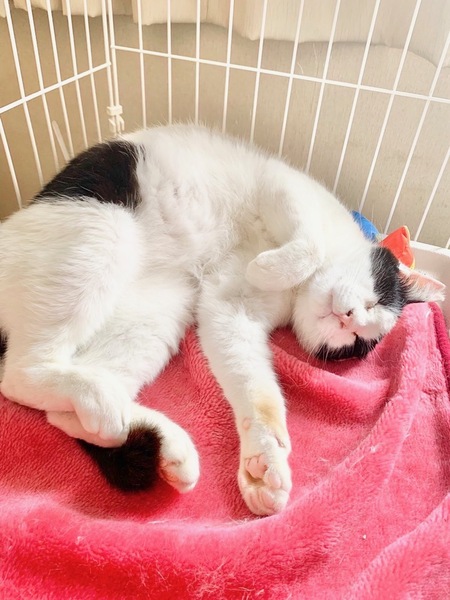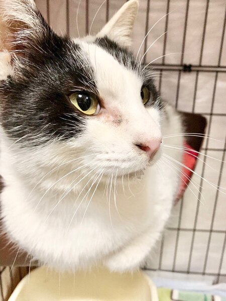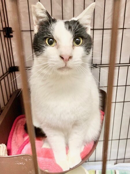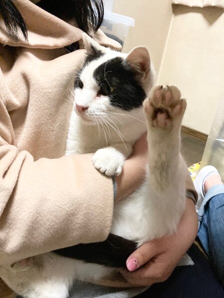 | 特徴(性格など) | 仮名パンナ君、白黒の男の子です。体重5キロ弱。 甘えん坊で、とにかく人も猫も大好きです。外に居た時は他の猫とも仲良く出来ていましたので、先住猫さんのいるご家庭でも1匹飼い希望のご家庭でも 暮らせるかと思います。 ウィルス検査、3種ワクチン、去勢手術、検便、駆虫済み です。 |