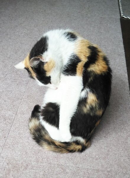 | 特徴(性格など) | とてもキレイな三毛猫です。白黒茶色がはっきり分かれていて、ぼやけた色合いではありません。尻尾はそんなに長くはないですが、真っ直ぐで太いです。 性格は人大好きの甘えっ子で、人の膝の上にすぐ乗ってきます。 少しばかりハスキーボイスですが、あんまり鳴く事も無く、おとなしい子だと思います。 健康状態は良好で、快食快便です。ウイルス検査は、猫エイズ、白血病共に陰性です。寄生虫駆除のために、フロントラインを滴下しました。 オッパイが大きくなっていますが、母乳は出てない状態で、子育て中ではありませんでした。乳腺炎等の兆候も無く、徐々に元に戻るそうです(獣医談)。 右前足に咬み傷があって化膿していましたが、コンベニア(2週間効果の続く抗生物質)を注射して、腫れも引いて傷も乾いてきました。 |