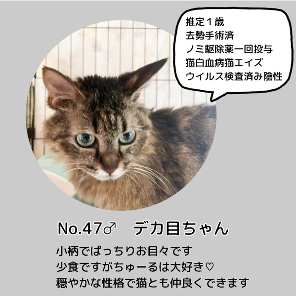 | 特徴(性格など) | No.47♂ デカ目ちゃん 推定1歳 去勢手術済 ノミ駆除薬一回投与 猫白血病猫エイズウイルス検査済み陰性 小柄で、ぱっちりお目々の子です 少食だけどちゅーるは好きです 穏やかな性格で他の猫にもフレンドリーです この子は現在京丹後市で保護されています お見合いの日程や場所についてはご相談の上設定します |