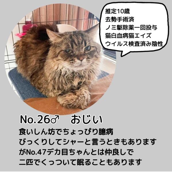 | 特徴(性格など) | No.26 ♂ おじい 推定10歳 去勢手術済 ノミ駆除薬一回投与 猫白血病猫エイズウイルス 検査済み陰性 食いしん坊でちょっぴり臆病 びっくりしてシャーと言うときもありますが デカ目ちゃんとは仲良しで 二匹でくっついて眠ることもあります この子は現在京丹後市で保護されています お見合いの日程や場所についてはご相談の上設定します まずはDMにてお問い合わせくださいませ |