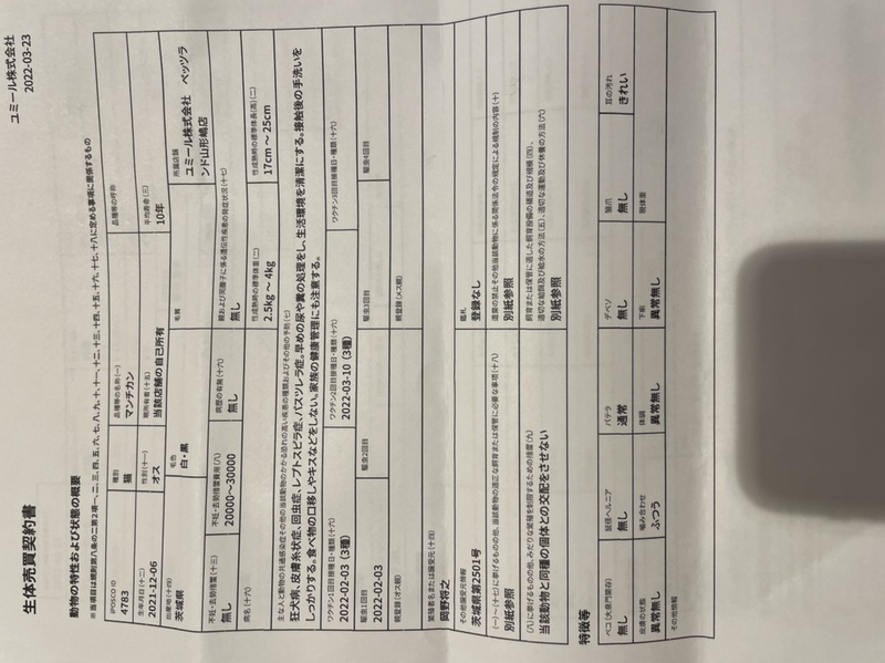 | 譲渡費用(医療費、交通費など) | 安心パック代50,600円(ワクチン、医療費、マイクロチップ等)のお支払いをお願いいたします。 15万円+安心パック50,600円で購入しました。 |