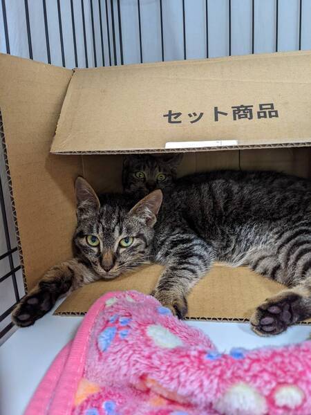 | 特徴(性格など) | 瓜二つな兄が居ます♪兄妹一のきかん坊!まだ撫でることも難しいお嬢様。 リコッタ メス 5ヶ月 ホイップ・キャンディ・チェダーと兄妹。 【特徴】 キジ 【性格】 現時点では、手を出すと叩くしすぐ離すけど噛みます。人間不信が兄妹一強いです。 この子を沈められる兄妹の誰かと一緒か、受け入れてくれる先住サンが居るお家が希望です。 一匹譲渡可 単身者応募可 60歳以上の応募不可 |