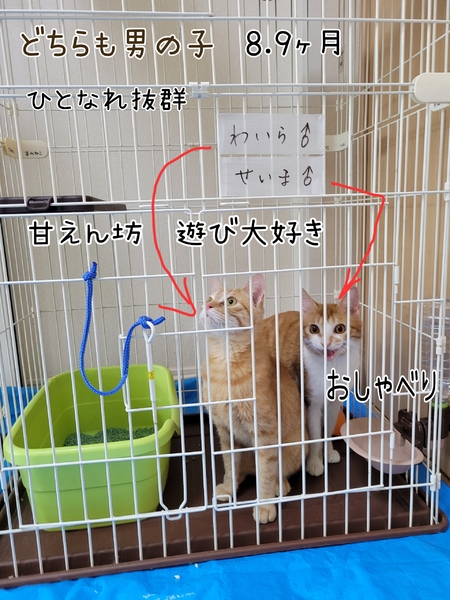 | 特徴(性格など) | やっぱり茶系は甘えん坊♡ 一緒に暮らしたら楽しい元気な男の子! 【仮名】 せいま 【特徴】 綺麗な茶白 可愛い顔立ち 【性格】 ひとなれ超抜群♡ 遊び大好き♡ 甘えん坊♡ お喋り♡ ゴロゴロいいっぱなしです(笑) 猫との社会性ばっちり! 遊び大好きなので、もう一匹ペアだとより楽しく暮らせると思います(*^^*) 初心者でもお迎えしやすい子! 単身者、60歳以上応募不可 |