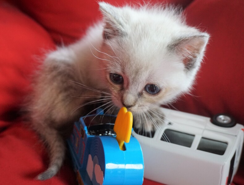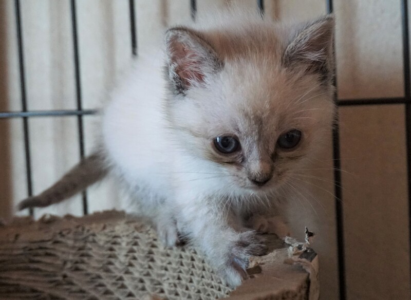 | 特徴(性格など) | シャム猫っぽく白くてフワフワしていたので雲ちゃんと呼んでいます。 しっぽはまっすぐです。 保護時は目ヤニで開いていませんでしたが、獣医さんのご協力のおかげでこんなに可愛くなりました。 性格は少し臆病でビビりです。兄弟たちとは元気いっぱい遊んでいます。 |
