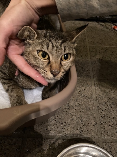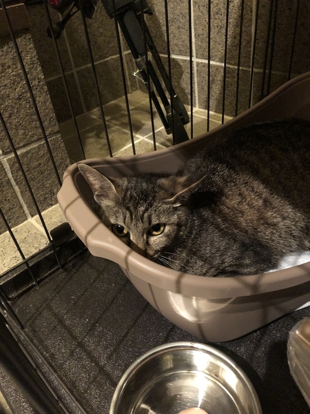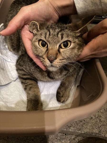 | 特徴(性格など) | キジトラの母猫。 人懐こく、ご近所でご飯も貰っていたそうです。 現在は怯えていますが、触れても噛んだり引っ掻いたりは無いです。 【追記】 チュールを指からでも食べました。 排泄もしましたが、脱水気味のようでからからの便でした。 水分補給ののパウチは食べました。 |