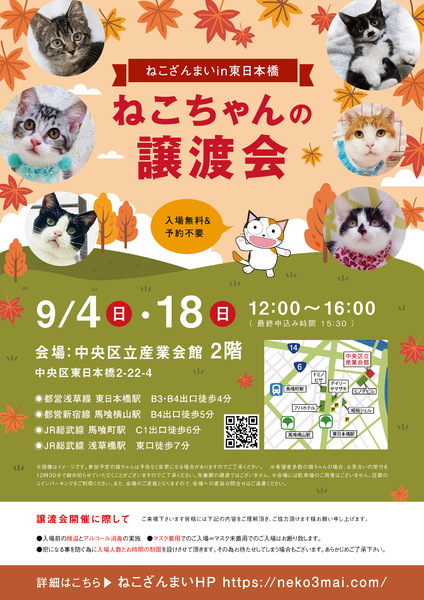 | その他(譲渡条件など) | 11:30より、2階会場入口にて受付を開始します。 受付時に入場予定時間が記入された整理券をお配り致しますので、整理券を受け取った方はお時間になりましたら2階会場入口に番号順にお並び下さい。 ※11:30より早くいらしてもお待ちいただく場所がございません。 また、近隣にお住まいの方や他階フロアのご利用者様にご迷惑となる場合がございますので、受付開始時間にあわせてお越しくださいますよう、何卒ご協力お願いいたします。 ※ねこざんまい譲渡会は、先着順で里親様を決定する譲渡会ではありません。 先に申し込みをした方を優先することもありません。 お話をして、その猫ちゃんに合ったおうちに決めさせていただいております。 12時に開場し、里親様の決定は14時以降となります。 14時以降にご入場の場合、希望の猫ちゃんが決定している可能性があります。 また1頭に対し多数のご希望をいただいた場合、早めに申し込みを締め切らせていただく場合がございますので、予めご了承下さい。 里親様決定は14時以降となります。 その後、迎え入れ準備の説明等のお時間も頂戴しますので、お時間に余裕を持ってご来場下さい。 【新型コロナウィルス感染予防対策について】 譲渡会開催に際し、ご来場下さいます皆様には以下の内容をご理解頂き、ご協力頂けます様お願い申し上げます。 ●入場前の検温とアルコール消毒の実施 ●マスク着用でのご入場=マスク未着用でのご入場はお断り致します ●入場人数の制限をさせていただきます(来場多数の場合は入れ替え制となります) ●時間と人数の制限=密になる事を防ぐ為に入場人数とお時間の制限を設けさせて頂きます その為お待たせしてしまう場合もございます ●会場利用規約により、ご来場者様の連絡先を控えさせていただきます あらかじめご了承下さい。 諸々の制限がございますが、安心・安全な譲渡会運営のためにご理解・ご協力いただきますようお願い申し上げます。 ~~~~~~~~~~~~~~~~~~~~~~~~~~~~~~ ★仔猫ご希望の里親様★ 仔猫ちゃんたちは、まだ体がしっかりしていない赤ちゃんです。 下痢だけでも数時間対応ができなかっただけ死に至る事もあります。 その為、月齢に応じたお留守番時間を設けさせていただいております。 また、子猫ちゃん(6ヶ月未満)の里親様には子猫支援金のご協力をお願い致しております。 ★猫ちゃんとのお見合いは譲渡会で!★ ねこざんまいの猫ちゃんは譲渡会でのお見合いのみとなります。 『この子はいつ譲渡会に参加するの?』『譲渡会場の場所はどこ?』などは、ねこざんまいホームページをご覧ください。 https://neko3mai.com/ ★楽しく猫ちゃんと触れ合って★ ねこざんまい譲渡会は、猫ちゃんも里親様も保護主も笑顔で過ごせる譲渡会を目指しています。 これから20年以上、楽しい時も、悲しい時もいつも傍にいてくれる大切な家族になる猫ちゃんです。 会場には沢山の猫ちゃんがいます。 1匹1匹、触れ合って猫ちゃんとお話してください。 『初めて猫ちゃんを家族に迎える方』 『先住猫ちゃんのお友達を迎える方』など トライアルの仕方や先住猫ちゃんと仲良くなるコツなど経験豊富な保護主やスタッフにお気軽にご相談ください! 猫を愛し、そして猫に愛されている猫好きスタッフと保護主がアドバイスさせていただきます。 ★里親希望のみなさまへ★ ペットではなく、家族一員としてたっぷり愛情を注いでくださるご家庭をお待ちしております。 恐れ入りますが ●学生の方、子猫・幼猫希望の60才以上の方のみのご家庭 ●脱走防止対策にご協力いただけない方 は原則譲渡を遠慮させていただいております。 ●一人暮らし・同棲(事実婚)の方 保護主の希望や猫の年齢・性格等により、ご希望に添えない場合もございます。 参加猫ちゃんは、それぞれ保護主(実際に猫ちゃんを自宅に入れ、保護をしている方)が異なります。 詳しい条件なども異なる場合がございますので、会場内で直接保護主とお話ください。 〖共通条件〗 1.終生飼育 2.完全室内飼い 3.脱走防止対策へのご協力 4.避妊去勢手術 5.契約書類へのサイン 6.定期報告 7.医療費等の負担 当日の猫ちゃんを連れて帰ることはできません。後日、保護主が里親様のご自宅までお届け致します。 その為、移動の際の猫ちゃんの負担を月齢などから考慮し、お届け地区を限定させて頂くこともございますのでご了承ください。 ご理解とご協力のほど宜しくお願い致します。 ☆よくある質問☆ ・譲渡の条件 ・ご負担頂く費用 ・譲渡会の場所等は ホームページに詳しく掲載させて頂いておりますのでご覧ください。 https://neko3mai.com/ メールでのお問い合わせはすぐにご返答出来ない場合がございますのでご了承ください。 ホームページ https://neko3mai.com/ お問い合わせ http://www.neko3mai.com/contact/form_general.html ねこざんまいブログ http://ameblo.jp/neko3mai/ |
