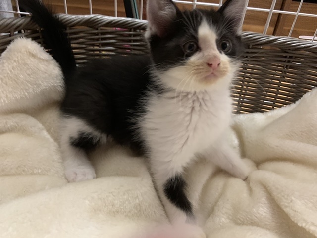 | 特徴(性格など) | 黒×白 成長不明 兄弟の中で1番人懐こく、小さくても元気いっぱいです。母猫は長毛ですがこの子は普通の長さだと思います。 ※まだ小さく血液検査はできていませんが、母猫の血液検査の結果は 猫免疫不全ウイルス(FIV)、猫白血病ウイルス感染症(FeLV)共に陰性の為、感染の可能性は限りなく低いとの事です。 |