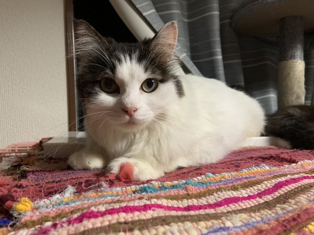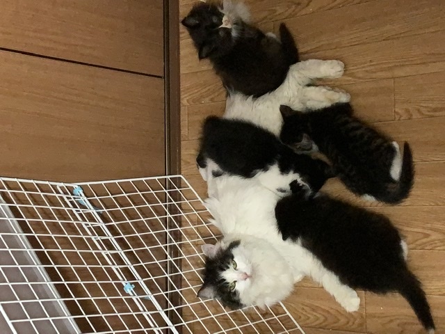 | 特徴(性格など) | 白×黒 長毛 4匹の子猫のお母さん。 猫免疫不全ウイルス(FIV)、猫白血病ウイルス感染症(FeLV)共に陰性。 保護した際はかなり痩せており、栄養失調や脱水などで見た目より弱っていました。今は栄養を取ってだいぶ元気になりました。 いつでも子猫優先の優しい猫です。まだまだ甘えたい年齢だと思います。撫でると喉を鳴らして喜びます。 |
