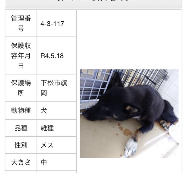 | 特徴(性格など) | 毛色…黒、足先茶色い 可愛いお顔の女の子です 唸りも威嚇もありません ただただ怯えています |