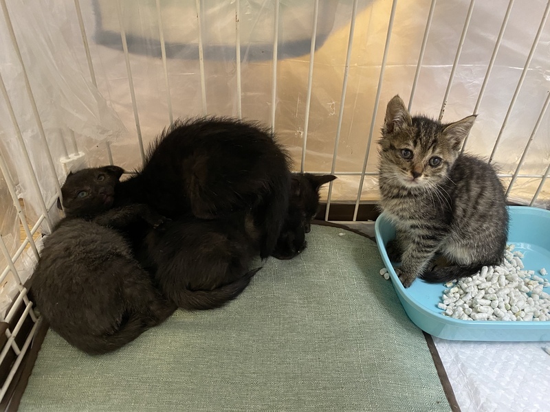 | 里親募集する理由 | 多頭飼育崩壊になっている家の屋根から保護しました。 屋根の上の絶妙な場所(かろうじて雨風凌げる)で生まれ育ったようです。 飼い主もどれが母親だか分からない、いつ生まれたかあまりよく分からないということで、ご飯も親猫にも十分な量は与えておりませんでしたので成猫達は順次避妊して環境が悪いので中猫以下は保護いたしました。 保護時はあまり月齢の割に元気もない様子でしたが、その他費用に含まれる療法食と点滴で回復いたしました。 ※シャンプーしてからお渡しします。 |