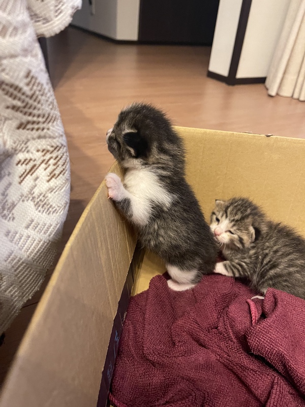 | 里親募集する理由 | 5月の中旬に 自宅の庭にダンボールの中に6匹の猫が置いてありました。 残念ながら4匹は既に亡くなっており 2匹がか細く鳴いているのを発見しました。 すぐにミルクをやり元気になり今に至ります。 保護当時推定2週間いってない位で 現在は3週いかないくらいです。 兄弟寄り添っててとても愛らしいです(❛ω❛) 3時間置きにミルクをやってます。 出来る事なら2匹一緒に引き取って下さる方がいれば 優先的に決めたいと思います。 本当に大切に育てているので生涯家族として 大切に大切にして下さる方お願いします。 先着などではなくじっくりお話して決めたいと思います。 必ず避妊、去勢、病院を怠らない事をお願いします。 引き渡しは6月中旬〜下旬を考えていますが 離乳食が始まれば早まるかもしれません。 それまでに見学にきていただいても構いません。 決まればご自宅まで連れて行きます(*•ω•*) |