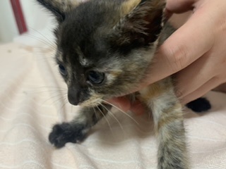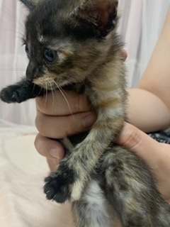 | 特徴(性格など) | 1ヶ月になりたての子猫です。 サビ柄の子で、小さめです。よく触って慣らすようにしています。家で産まれたので、威嚇等ありません。 |