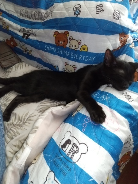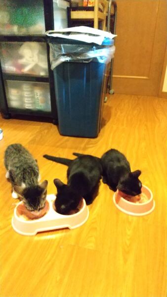 | 特徴(性格など) | 黒猫のオス1匹、メス1匹とキジトラのメス1匹です。 トイレは覚えました。 が、キレイ好きで掃除を怠ると部屋の隅で粗相します。 元気はいっぱいです。 少し目やにが有るので、病院で見て貰いました。 避妊やノミとり等はしていません。 |