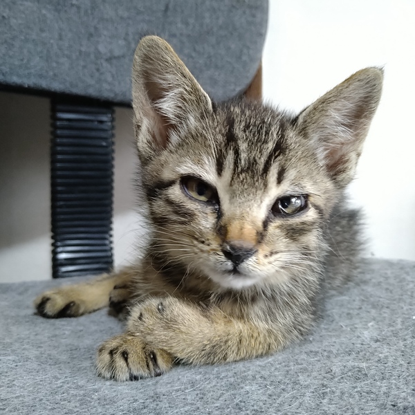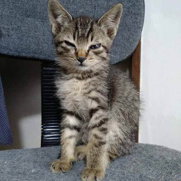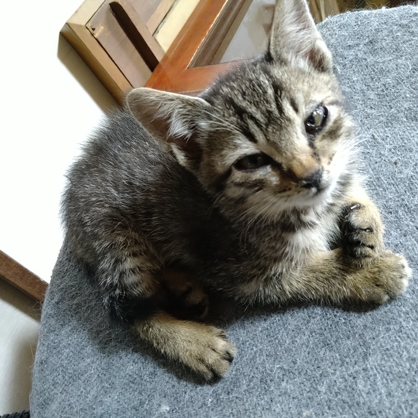 | 特徴(性格など) | おっとりしたキジトラの男の子です。少し人見知りですが、慣れると甘えん坊さんな所もあります。トイレもすぐに覚えました。特別困った癖もありません。良い子です。猫風邪を発症していましたが順調に回復しています。 | ||