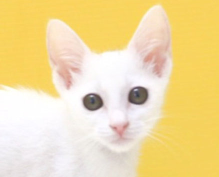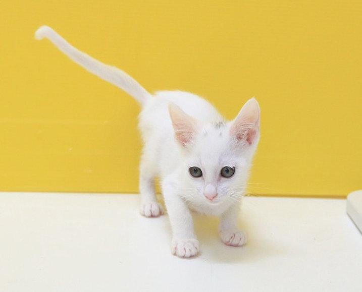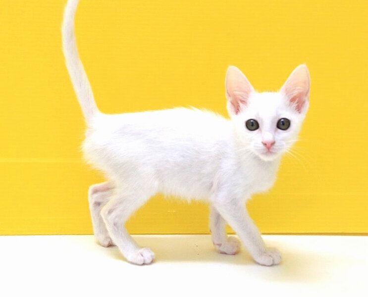 | 特徴(性格など) | 2022年4月生まれ。4s7、4s8、と兄弟(姉妹、兄妹、姉弟)で、この子は女の子です。 兄弟同様白色かと思いきや頭に少しだけ黒い毛が生えています。その黒い毛が少しだけムンクの叫びに似ていて、そこをなでなでされるのが大好きです。 お鼻も肉球も綺麗なピンク色。爪切りも抱っこも膝も無抵抗ですが、活発で好奇心旺盛です。 尻尾は先っぽだけクイッと曲がっていて、上手に幸運を引っ掛けられそうな鍵しっぽです。 だっこ○、爪切り○、膝のり○です。 FeLV陽性 現在の体調は安定しています。 |