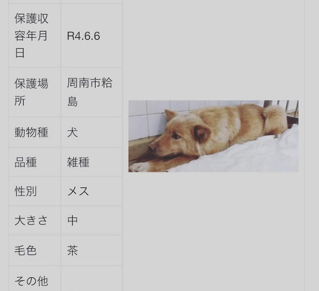 | 里親募集する理由 | 周南市は野犬が多く次々と収容されます 収容されれば1週間の期限が付けられ引き取りが無ければ、山口動物愛護センターへ移送され殺処分となります 野犬として生まれただけです 人間の身勝手な都合で同じ生きている命を無かったものにする行為は許されるものではありさん 元はと言えば人間が捨てたことから生まれたものです 野犬だからとなぜ差別するのでしょうか 野犬は人間が怖いのでただただ怯えています 時間をかければ愛情は必ず伝わり 家庭犬として何ら変わらない 可愛いく愛おしい存在になる事は間違いありません 今までも沢山の野犬が里親さまの元へ譲渡されています この子達は死ぬか生きるかの選択しかありません どうかこの子達の命を無かったものにはしないでください どうか家族として終生大事に寄り添っていただきたいです |