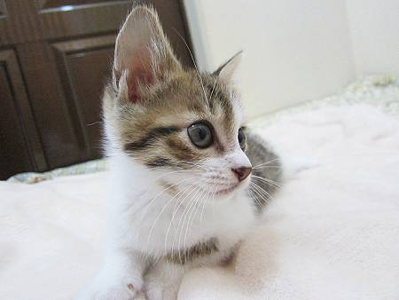 | 特徴(性格など) | キジ白 しっぽは短めのかぎしっぽです。 ケ-ジから出すと元気いっぱいで走り回っているやんちゃ坊主ですが、膝に乗せてナデナデするとグルグル喉を鳴らす甘えん坊くんです。 離乳済み、現在は子猫用のドライフードとパウチを食べています。 トイレもOKです。 |