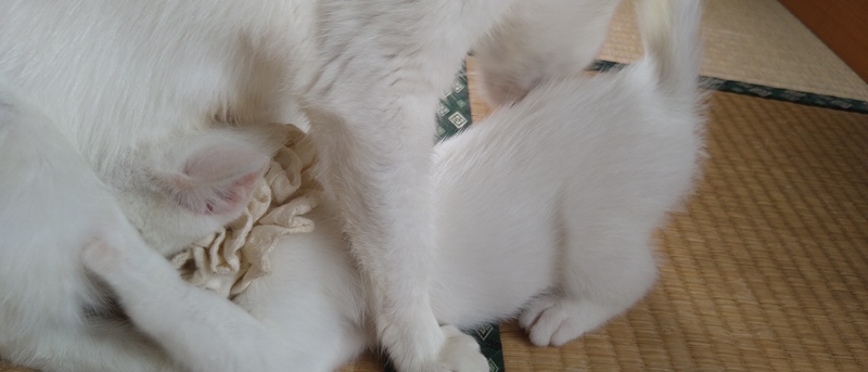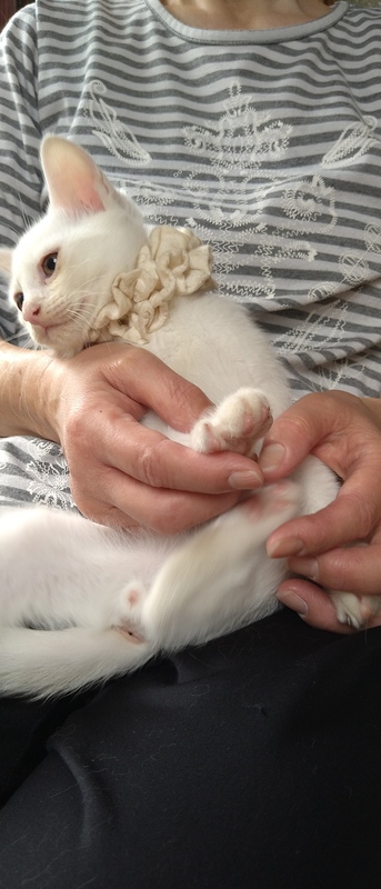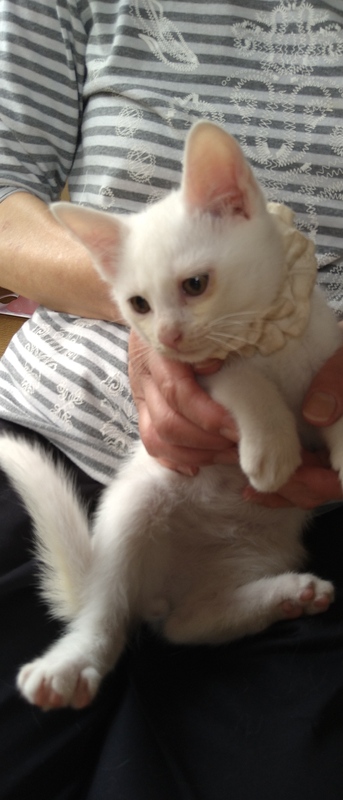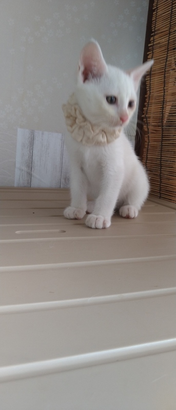 | 特徴(性格など) | ちょっとシャイで怖がりな白猫の男の子です。寂しがり屋さんで母猫のそばにいたがります。猫風邪は目の炎症がありましたが、順調に回復しています。 | ||