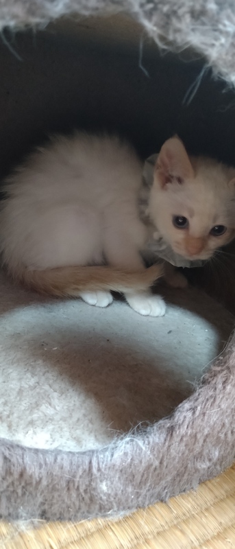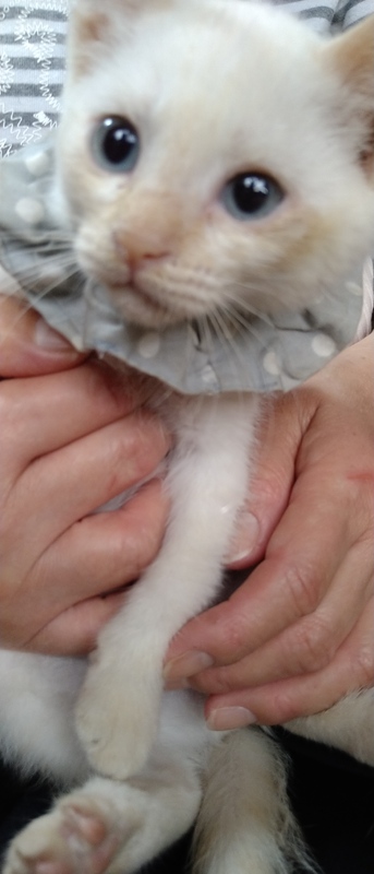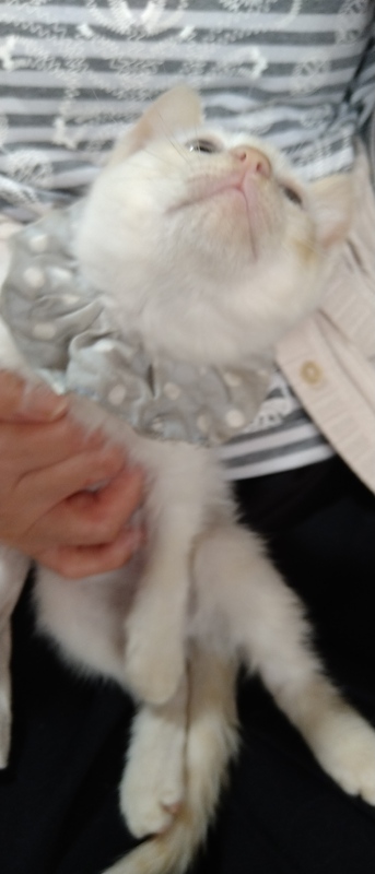 | 特徴(性格など) | 他の子より小さい白茶猫(耳としっぽだけ茶色)の女の子です。少し怖がりですが、よく遊びよく食べよく寝ます。猫風邪で目の炎症がありますが、順調に回復しています。 | ||