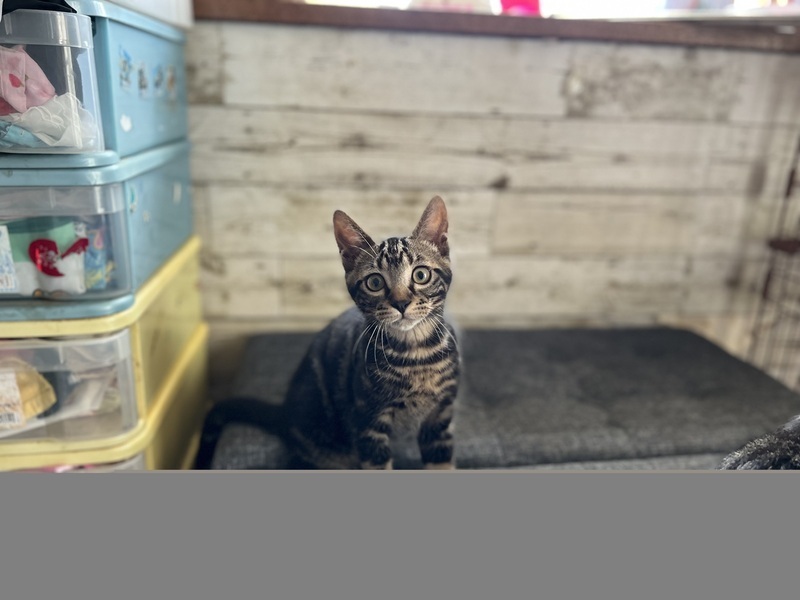 | 特徴(性格など) | 【仮名】ヴォルフガング・フォン・クラフトマン(パッチドタビー) 【性格】旗揚!けものみち! ヴォルフガングくんはネコキャラクターのダヤンに似ています! 大きなお目目に白いアイラインが特徴的です! なんだかおっとりしているヴォルフガングくん(^-^; 一緒に居るセサミやゴマちゃんたちにおされぎみ? ウェットフードもカリカリもよく食べます! おもちゃ遊びも大好きで、激しく遊びます! かけっこすると長いしっぽを立てて走り回って可愛いです♪ 爪切りも嫌がらず切らせてくれます。 いっぱいかまってあげたい方にオススメです☆ たくさん遊んで甘やかして慣らしてほしいと思います。 ※1ピキ譲渡もご相談ください |
