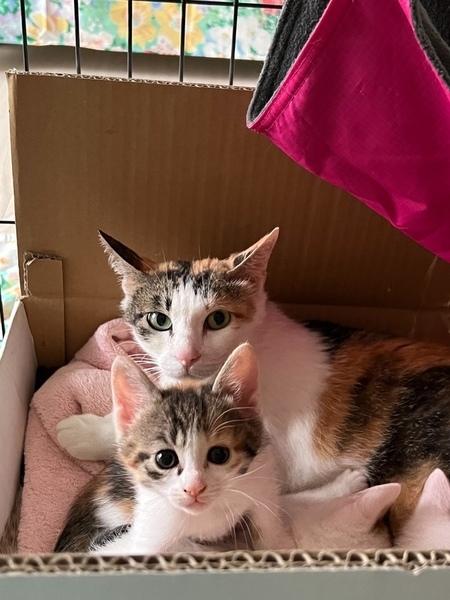 | 特徴(性格など) | 三毛のお母さんと、乳離れしたばかりの赤ちゃん♂♀3です。 赤ちゃんは三毛猫1匹(♀)、白茶(♂)2匹です。 |