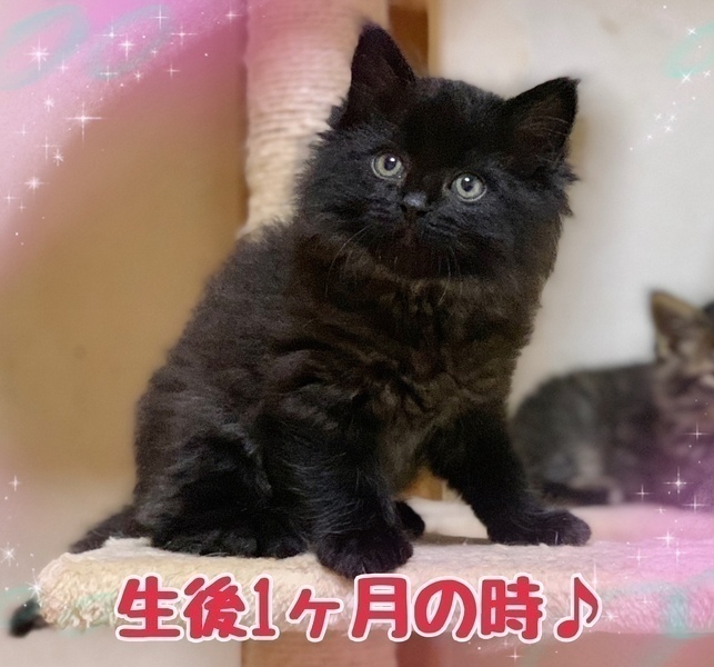 | 特徴(性格など) | 【仮名】オリオンくん 【性格】モッコモコでフッワフワな 毛玉ちっくなオリオンくん♪ だが相変わらず黒猫は写真がムズイ! 実際は写真の100倍カワイイです(笑) 写真では真っ黒い毛玉にしか見えませんが 首~お腹はキレイなシルバーの毛並みで なんともナデ心地サイコーなんです! わりとマイペースではありますが 人を見ると寄ってきます(笑) 寝る時は常に一緒ですよ~♪ 兄弟イチのビッグボディを生かした おもちゃ遊び争奪戦は全勝です(笑) 仲良しのトッツォくんか同室のチビッコと ペアでのお迎えを希望します♪ ※1ピキ譲渡不可 |