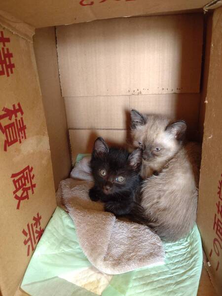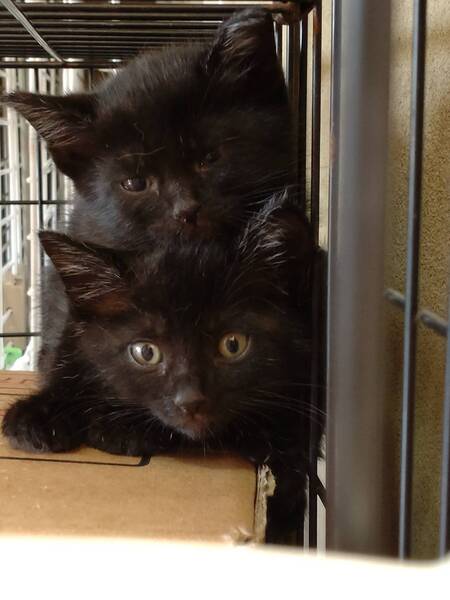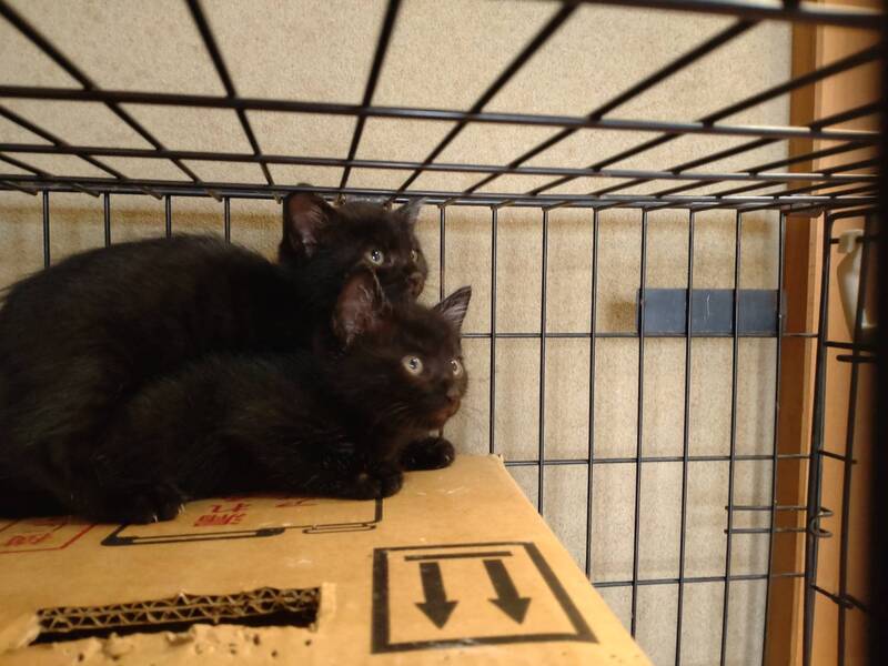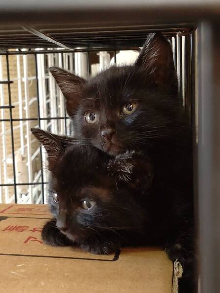 | 特徴(性格など) | やや長毛・毛量の多い黒猫兄妹。 元気いっぱい、兄妹どうしでコロコロ遊び回っております。 人なつっこく、可愛らしい子猫達です。 |