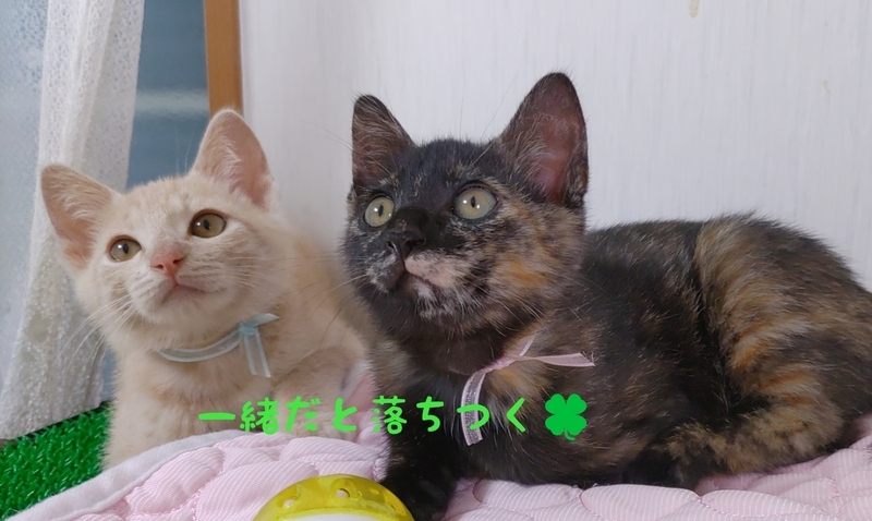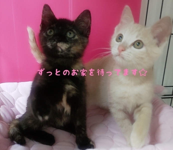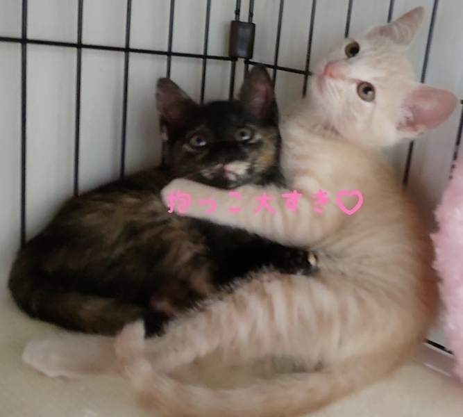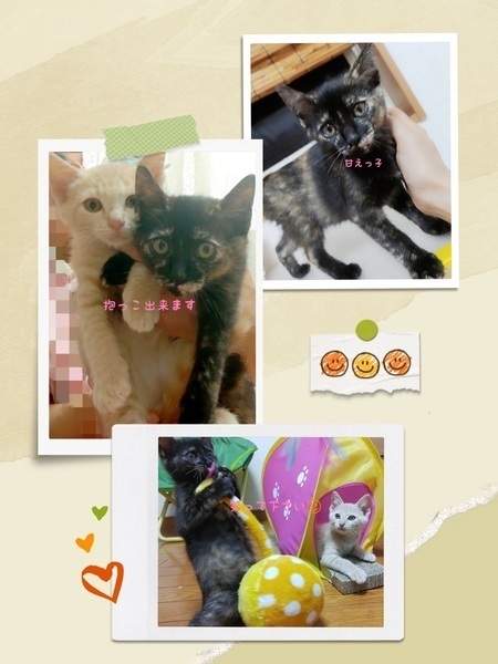 | 特徴(性格など) | 預かり.代理投稿です サビ柄ちゃん 二つとない世界にこの子だけの 個性豊かな柄の女の子 トラ君の尻尾で遊んだり 時々見せるオッサンスタイル 目が合うとニャーと寄って来て 見た目とのギャップが 笑い有りのユニークで 特別な可愛らしさいっぱいの 女の子です。 トラ柄君 好奇心旺盛 猫ジャラシを見せると 元気いっぱい遊びます。 2匹を預かり直後は お母さんの教えを守りシャーの ご挨拶でしたが半日程で落ち着き 撫でたり猫ジャラシで遊ぶと ゴロゴロ快適音を聞かせて くれました♬ 仲良く遊んだりくっついて寝たり 微笑ましい瞬間がいっぱいで 見とれてしまい気付いたら もうこんな時間の 癒されっぱなしの毎日です☺ 仲良く遊んで くっついて寝て 留守番の心配なく手のかからない 御利口さん兄妹なので 初めての方でも飼いやすいと 思います?? 4兄妹です 一度に4匹全員の預かりが 見つからず 兄妹、お母さんとお別れしてから サビちゃん♡トラ君は病院で 支え合いながら 先ずは仮のお家(預かり)を 待っていました。 全く違う毛色ですが 先に家族が出来た兄妹と 母さんのように サビちゃん♡トラ君にも 家族が出来 どうかいつまでも一緒に... が願いであります <(_ _)> |