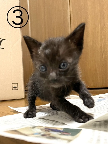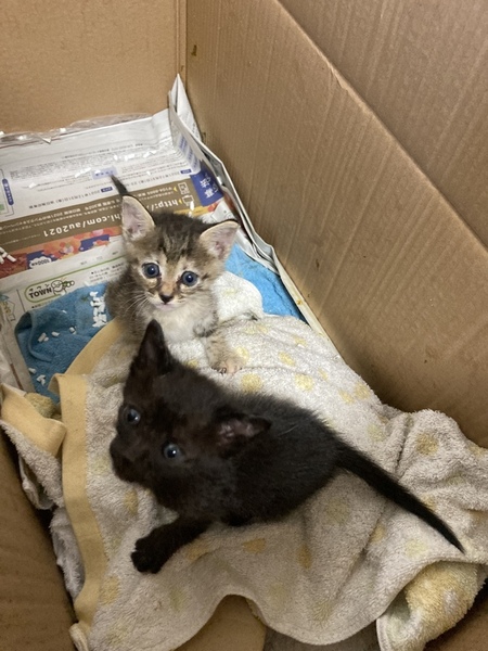 | 特徴(性格など) | 4匹ともに動物病院診察によると生後3週間弱です。(2022/6/26現在) (里親決定)1匹目→黒、オス、しっぽ折れてる形、活発 (交渉中)2匹目→黒、オス、シッポ真っ直ぐ、目ヤニ(目薬で治りました)、活発 写真→①の右側と③ (里親決定)3匹目→キジトラの白と黒、メス、目ヤニ、若干活発 (交渉中)4匹目→キジトラの茶白と黒混合、メス、左目上ちょっとキズのようなもの(自然治癒しました)、大人しめ 写真→①の左側、② |