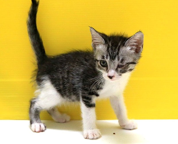 | 特徴(性格など) | 灰色に近いキジ白です。しっぽは慎重にゆっくり触ると細かくウェーブしているのが分かりますが、見た目はほぼまっすぐです。左前足だけ真っ白なのが、なんとなく腕まくりしているみたいです。 残念ながら左目は入所時から癒着しており、今後も開かないと思われますが、日常生活にはまったく支障ありません。 お膝に乗るとすぐグルグル喉を鳴らし、 後頭部やしっぽの付け根を撫でられるのが大好き。人懐っこさ抜群です! |