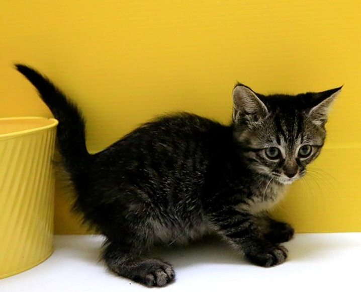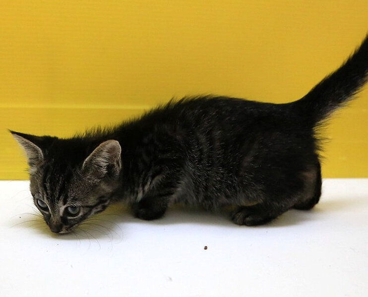 | 特徴(性格など) | 黒に近い濃い目の被毛が美しいキジトラです。 しっぽはまっすぐで先はほぼ黒色です。 キジトラにしては黒いひげが多く珍しいのと、耳の先の房毛がぴょこんと長いです。 おっとりした性格でゆっくり動きます。力は強いですが、爪切り時も大人しいので、上手にできるいい子です。 |