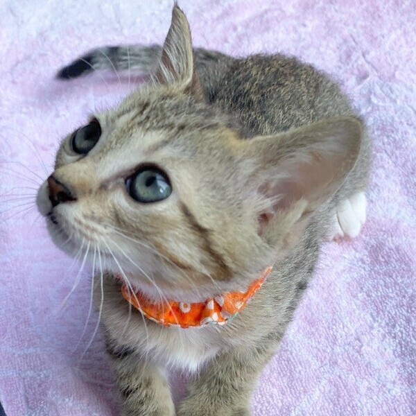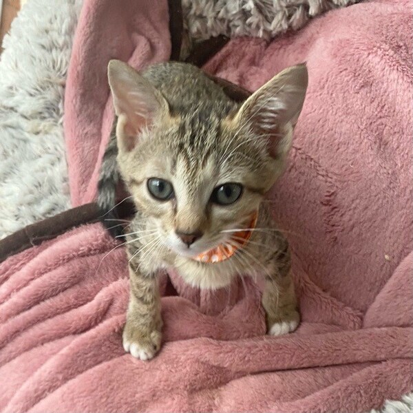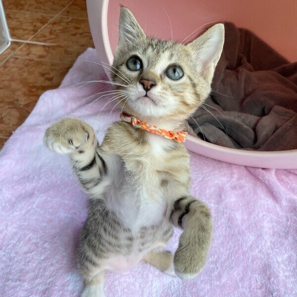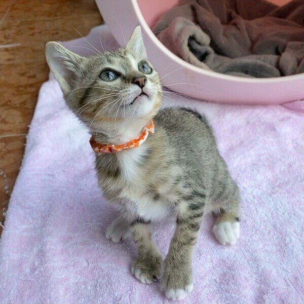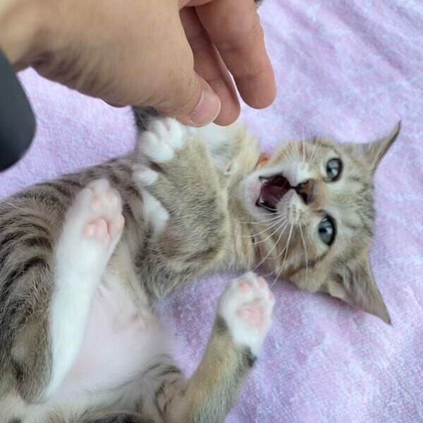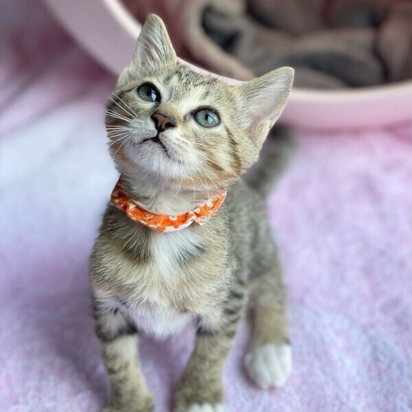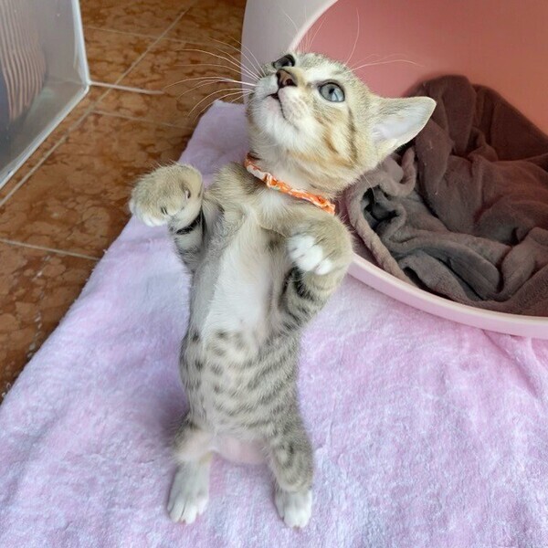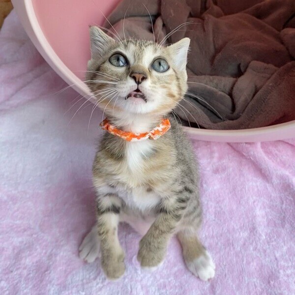 | 特徴(性格など) | いつもぴょんぴょん元気いっぱいの陽気な「木苺」ちゃん❤ なんだけど、他の猫ちゃんたくさんいると、ちょっとビビって、預かりメンバー膝の上に♪ ちょっと内弁慶な甘えっコ 現在、ドライフードを24時間の置き餌として栄養補給、水分補給のため一日4回パウチ&離乳食を与えています。 まだ月齢も小さく、一日1回の体重測定により減少している、などの場合は哺乳瓶で離乳食の強制給餌を行っています。 <推定誕生日:2022年4月始め> |