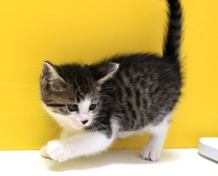 | 特徴(性格など) | 4s112、4s113、4s114、4s115、4s116は、兄弟姉妹(兄妹、姉弟)です。明るめのこげ茶と白の毛色が綺麗に分かれたキジ白です。 心なしか、他の子よりも顔が大きめなので、目も大きくクリクリしており、目ヂカラがあります。(笑) しっぽはまっすぐ。 爪を切るとき少しだけ抵抗し、ミャーミャー鳴いていました。 ちいちゃいながら「嫌なことは嫌!」と言うタイプのようです。 |