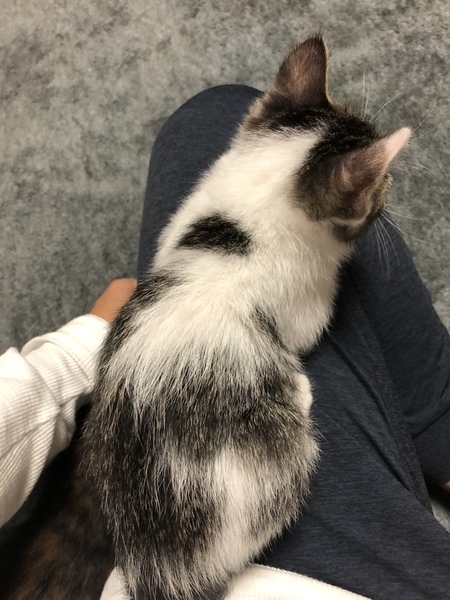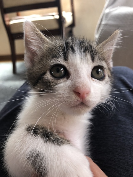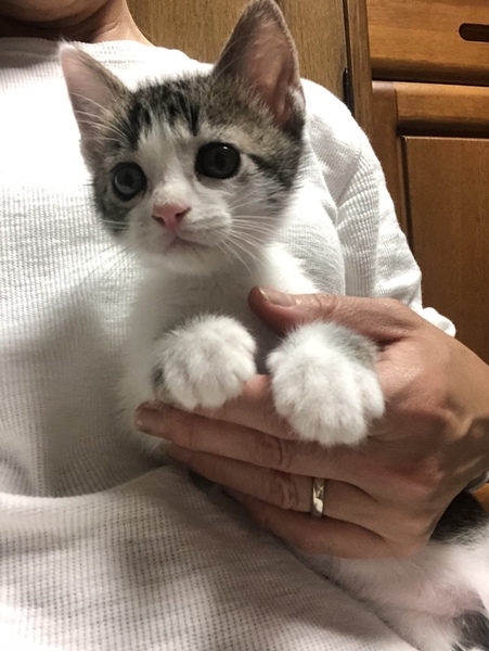 | 特徴(性格など) | 白とグレーのまだら模様のオス。生後1ヶ月の元気で活発な子です。 | ||