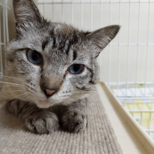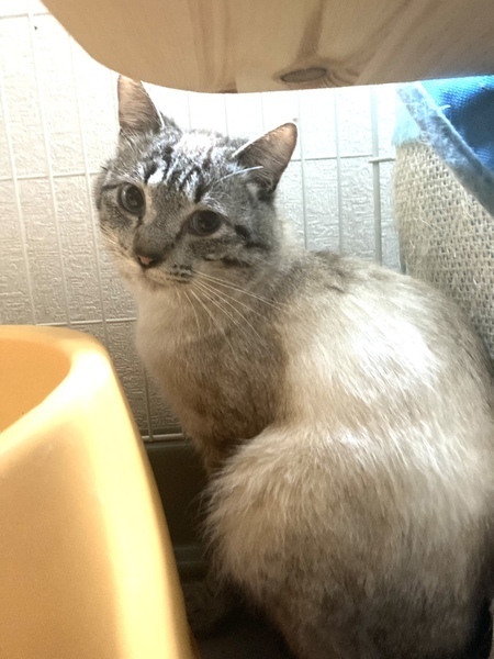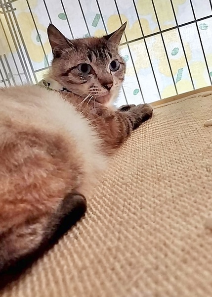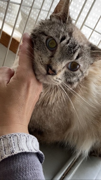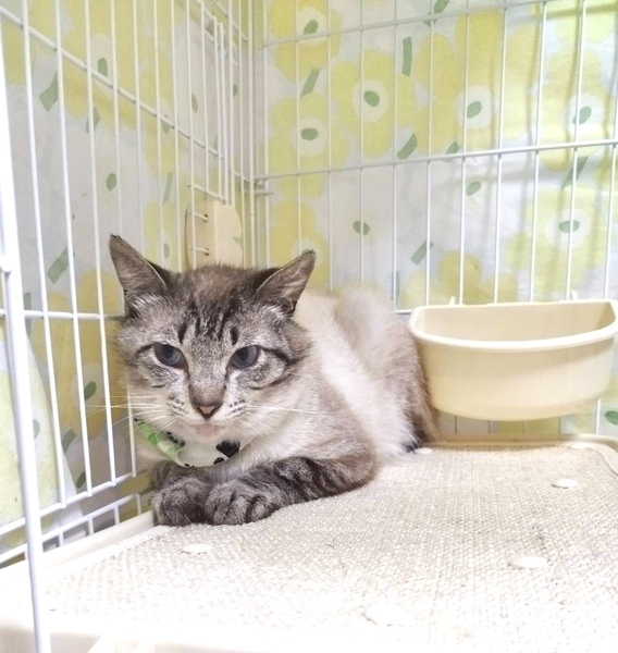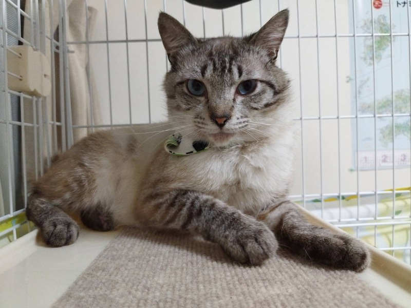 | 特徴(性格など) | ブルーアイのシャムMIX君。 大変大人しい飼いやすい性格で怖がりさんです。 慣れると、お尻をトントンしてあげるとゴロゴロと言います。 左後ろ足と尻尾が山の獣に噛まれてありません。 短くなった尻尾はお尻がウサギのようで、ジャパニーズボブテイルのように見えます。 ハンデはございますが、生活に支障はございません。 |