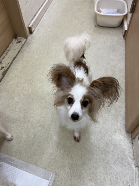 | 特徴(性格など) | かわいくておとなしい女の子のパピヨンです。少し怖がりですが、性格上特に気になるところはありません。 パピヨンらしく明るく前向き。 おトイレトレーニング中です。 |